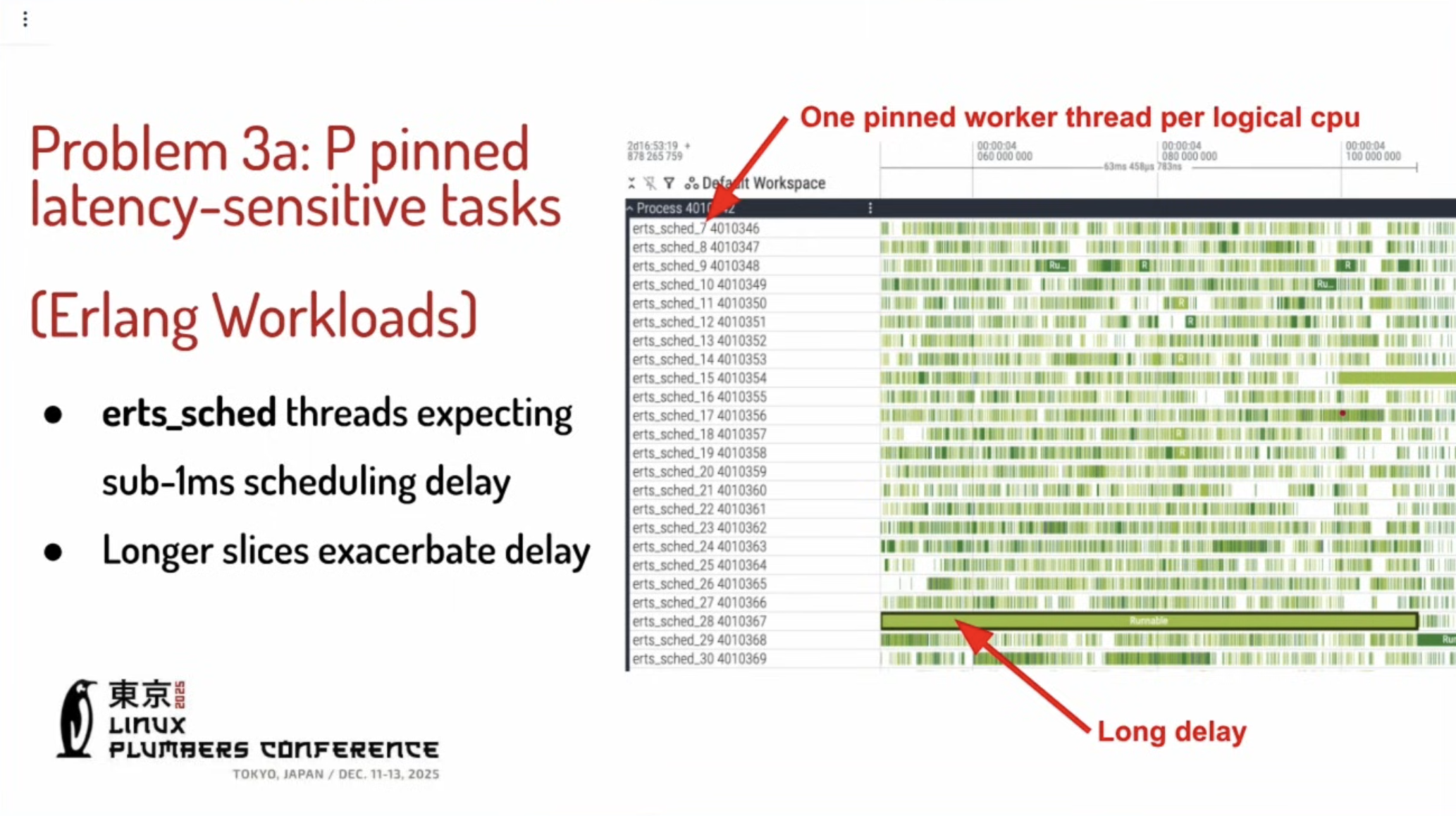 Remember that the Erlang scheduler thread has CPU affinity set, so it can only run on, say, CPU 3. But lavd didn't have per-CPU queues at the time. It dumps the thread into the shared LLC DSQ alongside everything else. So the Erlang scheduler thread only gets picked up when CPU 3 happens to pull from the front of the DSQ, which might not be for a while.
